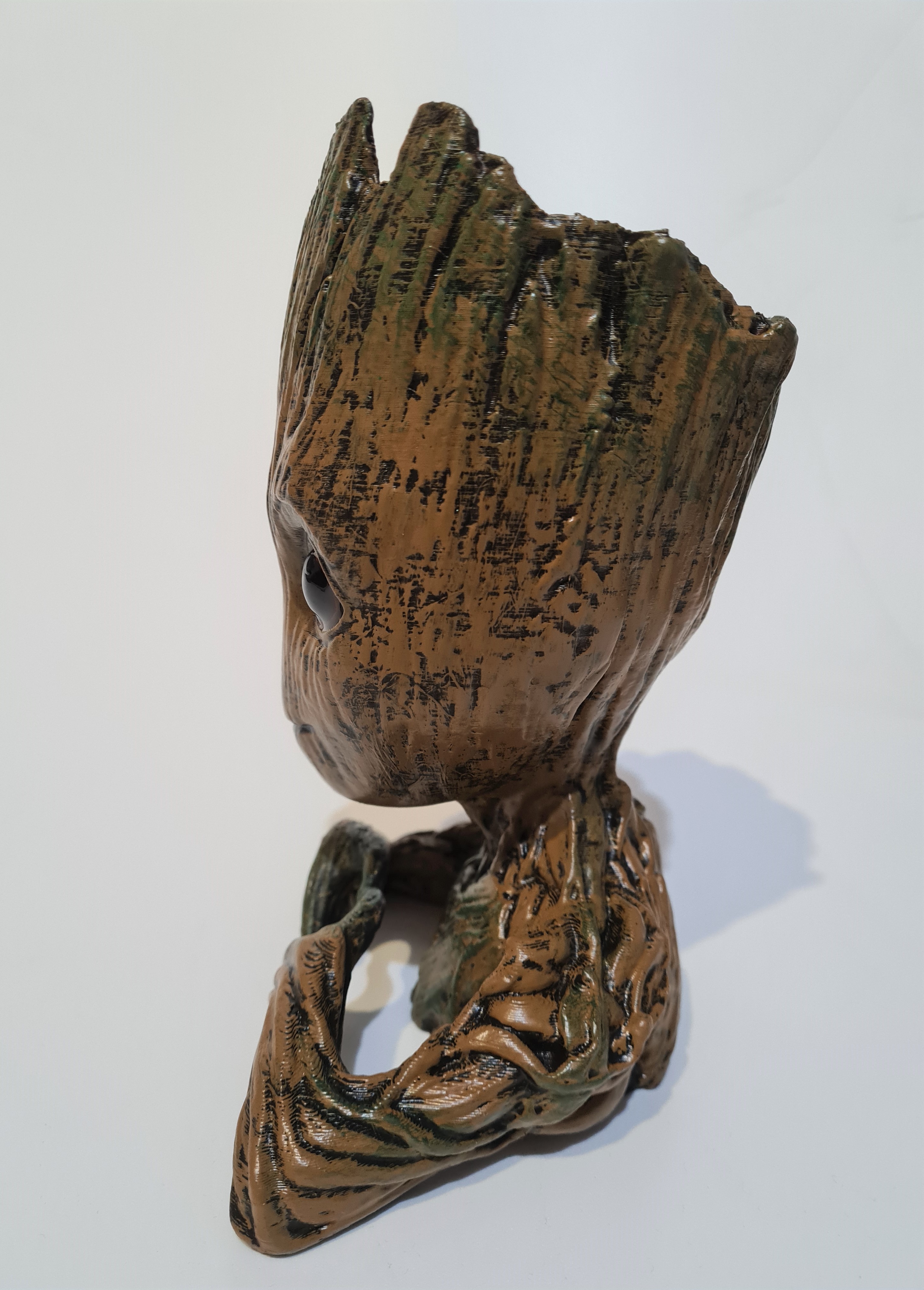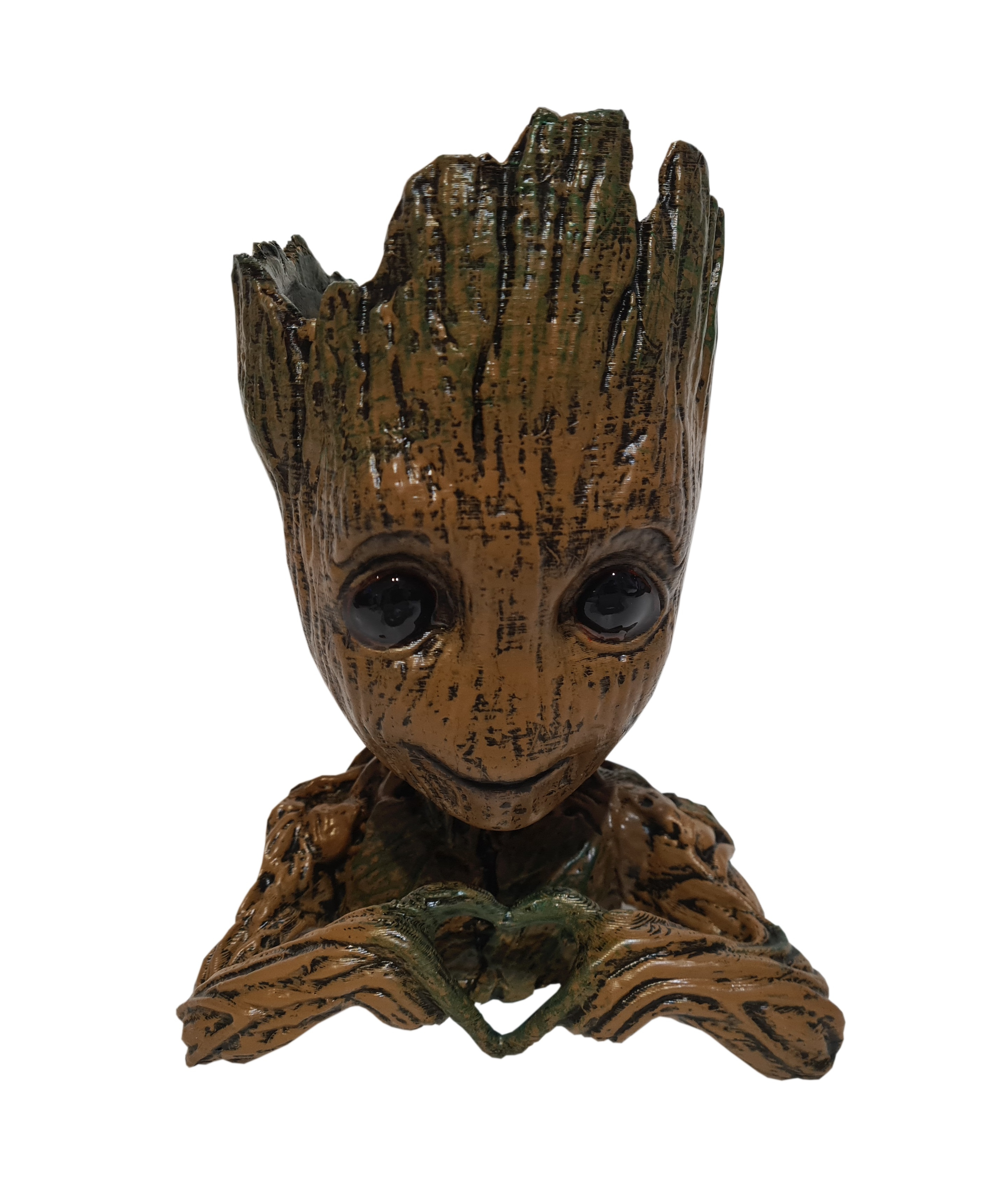 Indragitul personaj Groot, intr-o forma unica, cu rol decorativ. Modelul este realizat printr-un proces de imprimare 3D, la inalta rezolutie, din material plastic sustenabil, de calitate. Finisajele sunt realizate complet manual, prin vopsele acrilice, protejate cu un strat de lac mat. Modelul poate acomoda o planta naturala, de dimensiuni mici, servind in acelasi timp drept ghiveci. Desigur, spatiul interior poate fi folosit dupa bunul plac al utilizatorului, ca un suport pentru instrumente de scris / desenat, bomboniera si exemplele pot continua.