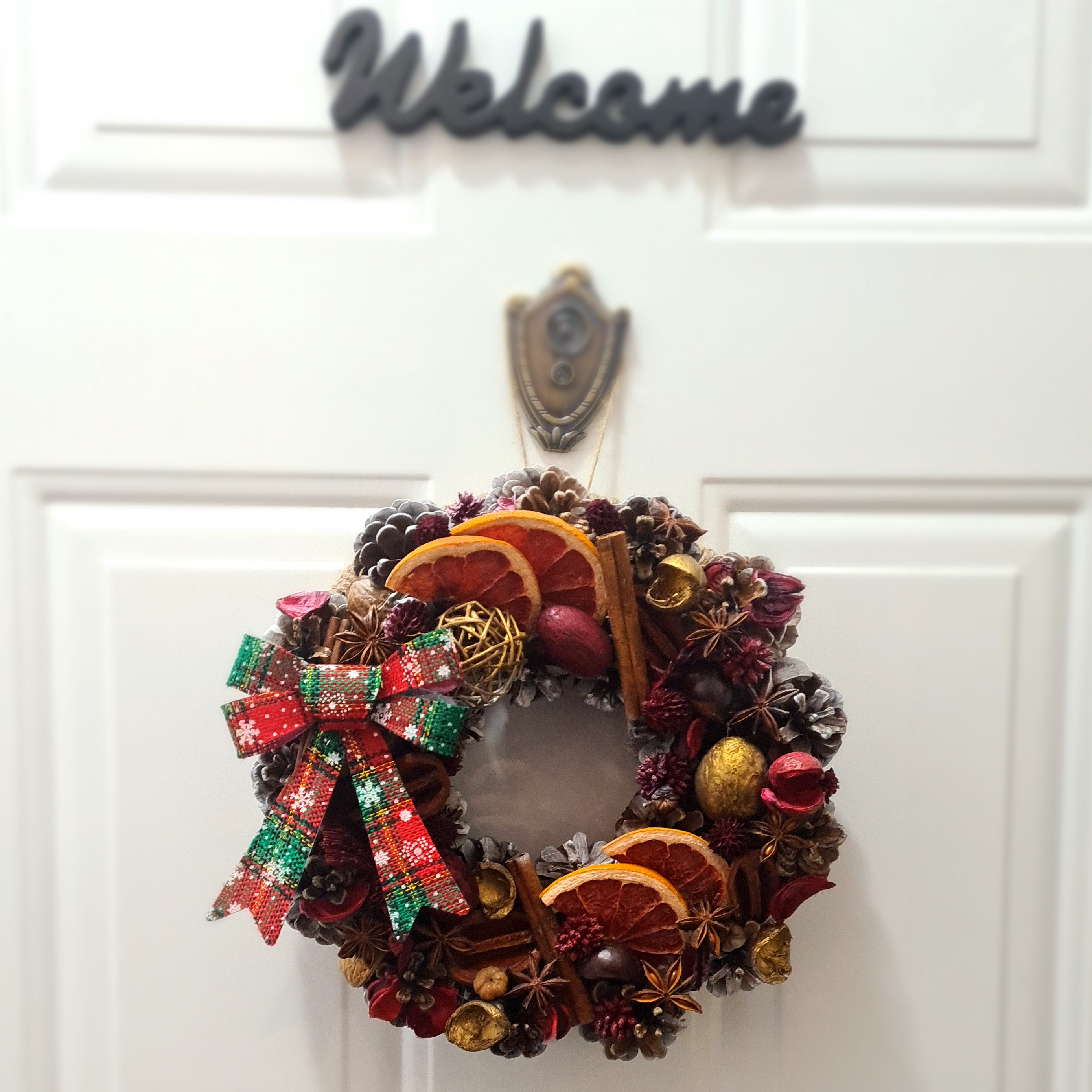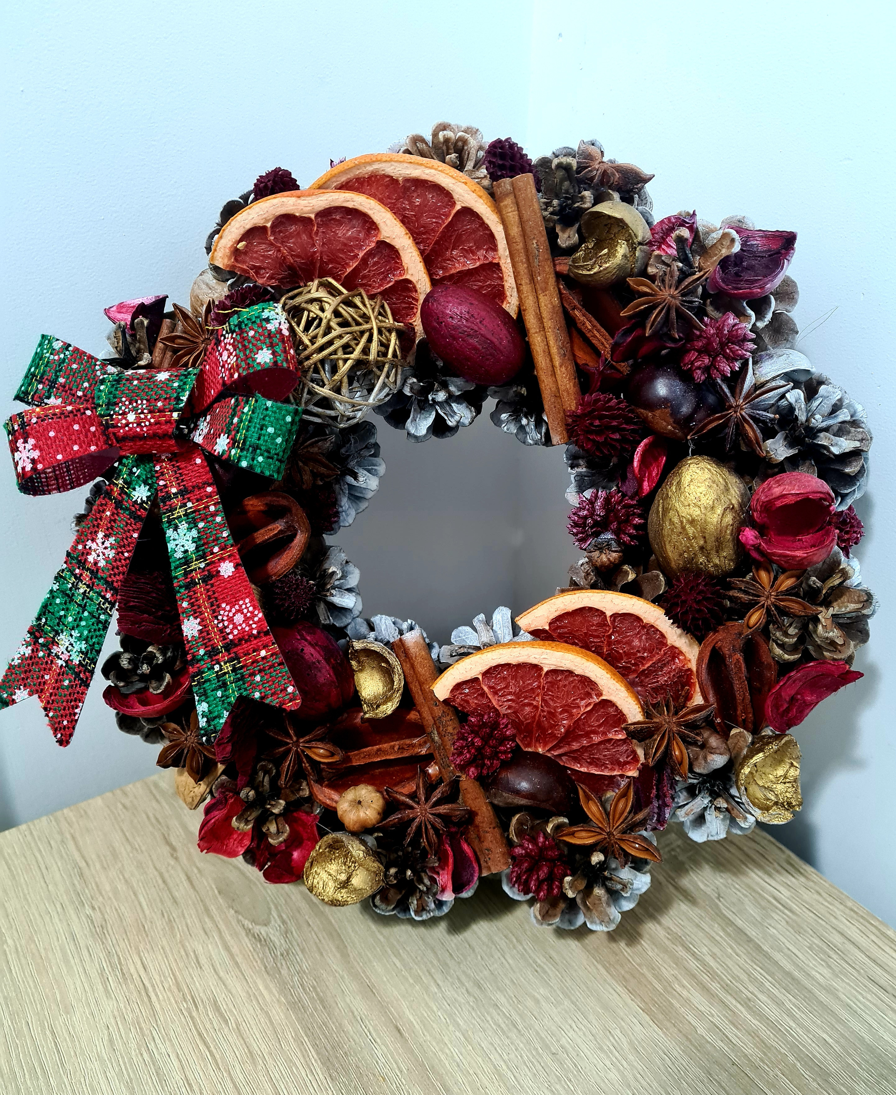 Coronita cu motive clasice, pentru sarbatori intr-un decor traditional, realizata complet manual din conuri de brad naturale, fructe deshidratate, bete de scortisoara, castane si evidentiata printr-o funda din material textil, in culorile reprezentative ale Craciunului.