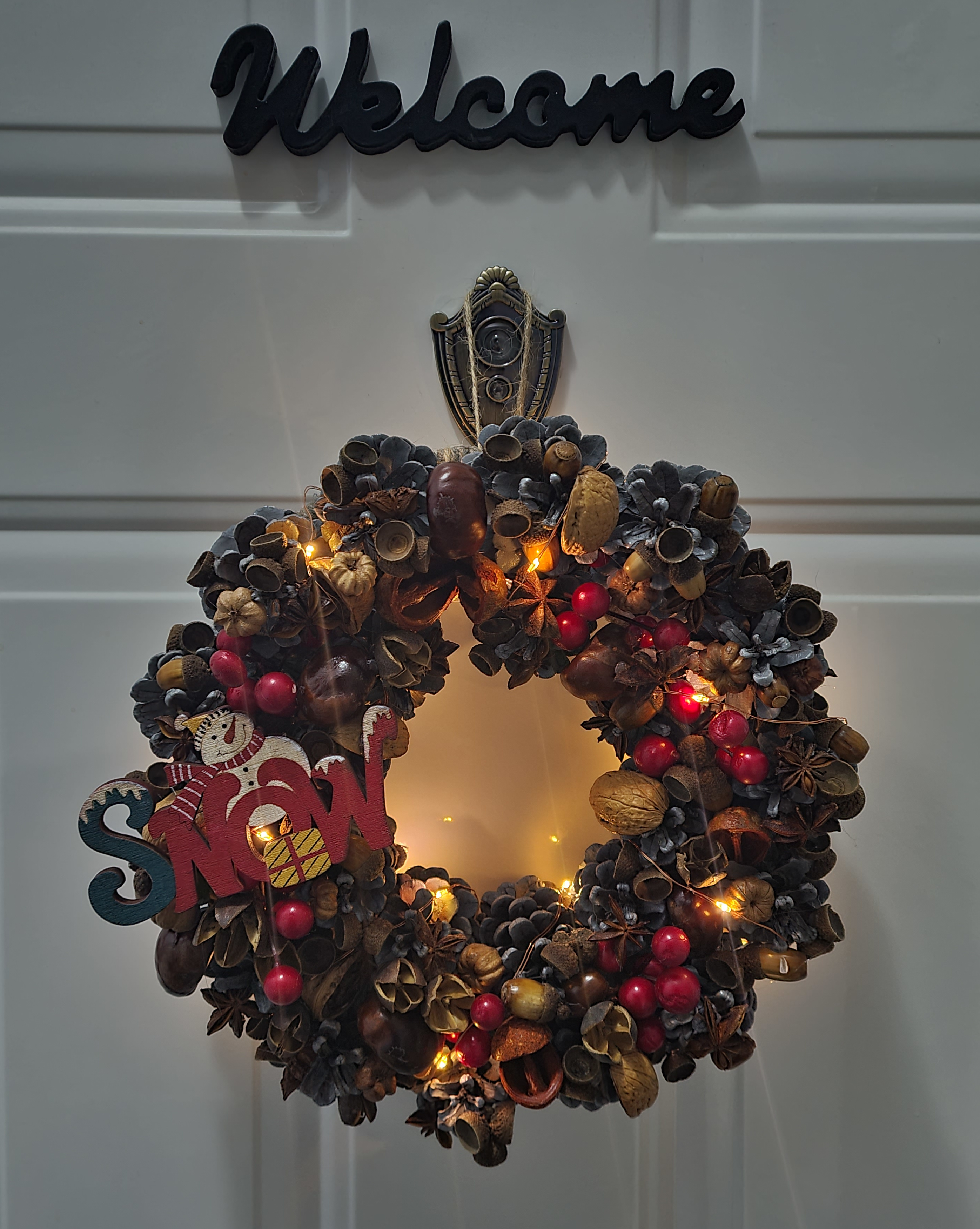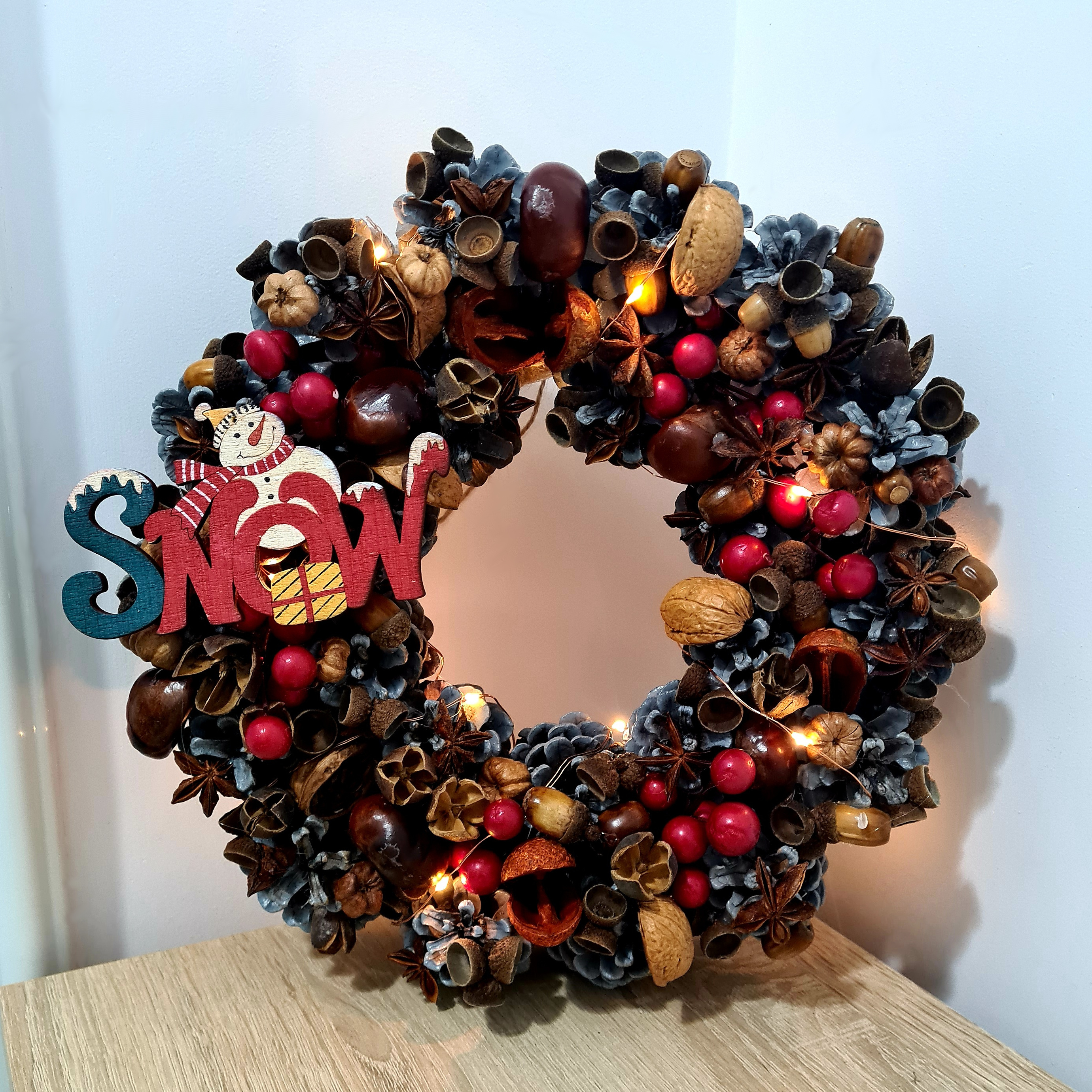 Alcatuita din elemente naturale, precum: lemn, conuri de brad, ghinde, castane, coaja de nuca si  accesorizata cu figurina omului de zapada. Se poate utiliza atat ca element de decor pentru usi si ferestre, cat si ca reper in cadrul unor evenimente sau festivitati tematice.