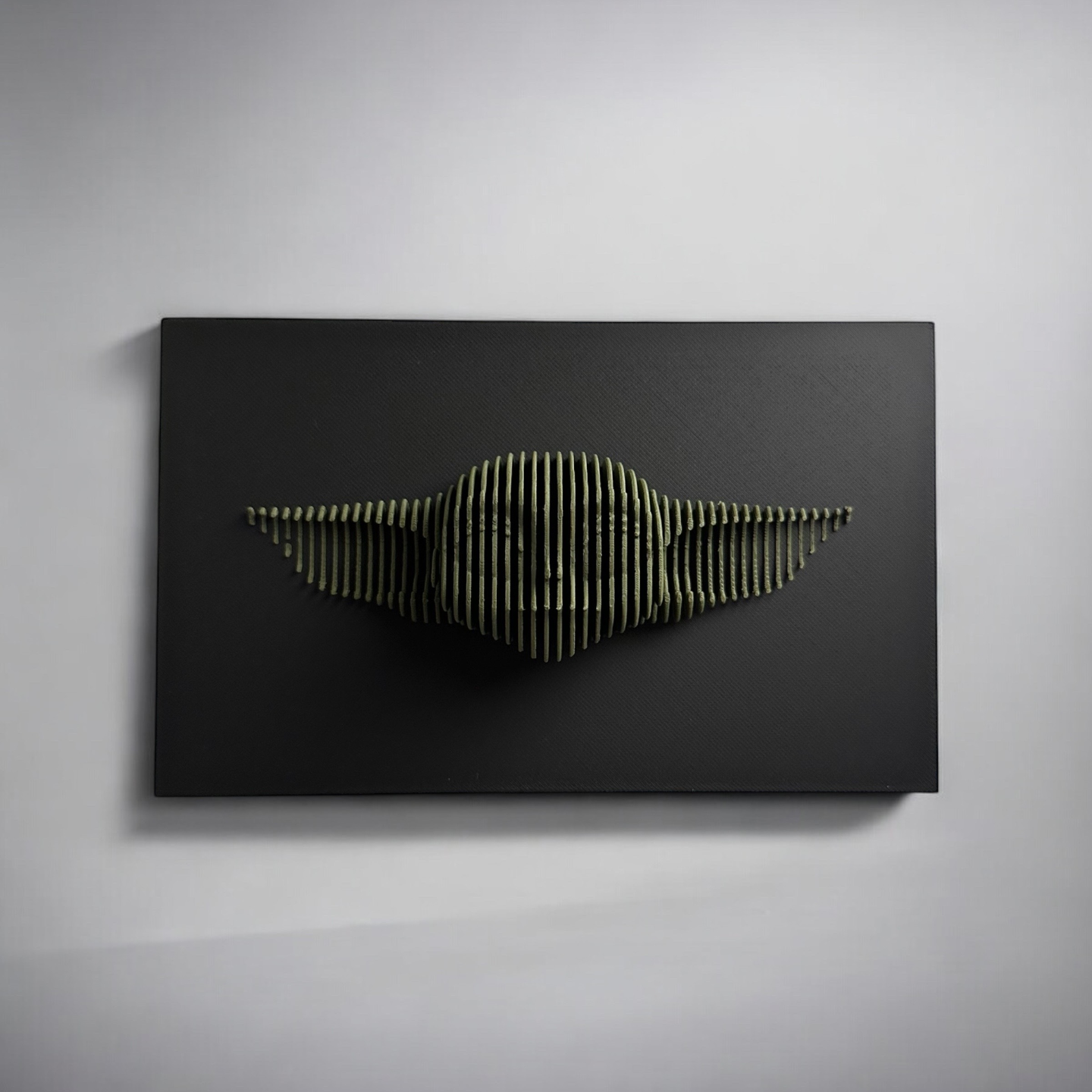Tablou 3D in Relief Grogu (Baby Yoda) “ Sculptura Printata 3D, Baza Neagra, Contrast de Culoare, Inspirat din Star Wars