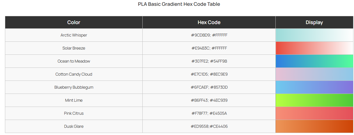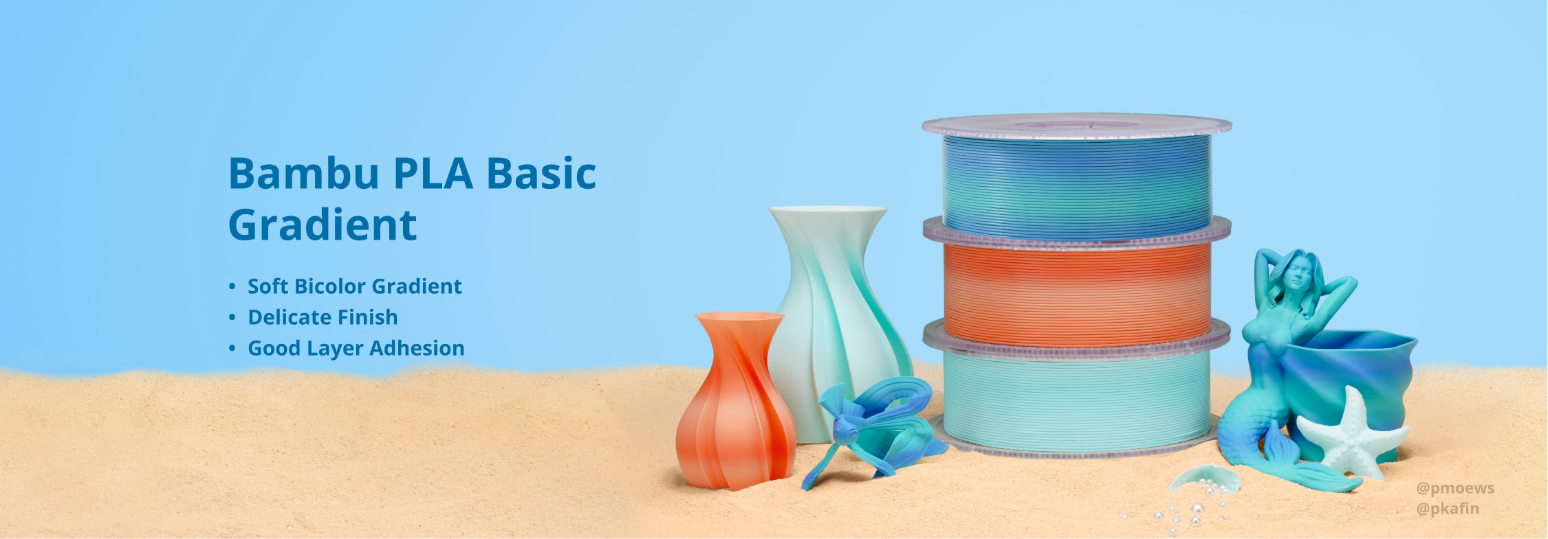 • PLA Basic Gradient este o nouă opțiune coloristică a seriei PLA Basic — folosiți setările implicite de PLA Basic. Pentru o calitate superioară, setați viteze mai reduse (atât la perimetre, cât și accelerație).
