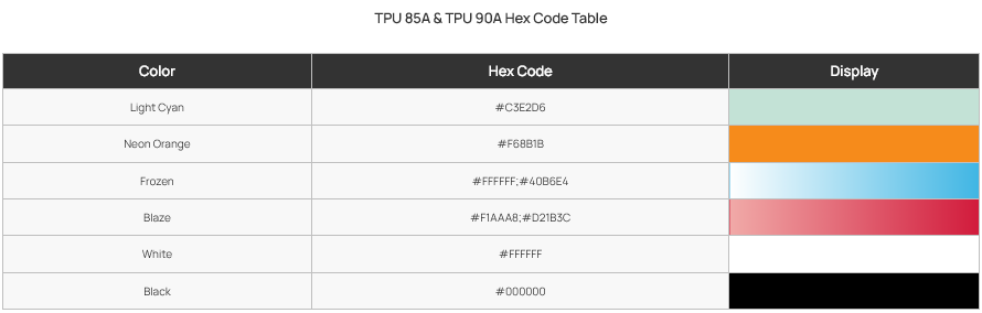 • TPU 90A: 0.4 mm / 0.6 mm / 0.8 mm